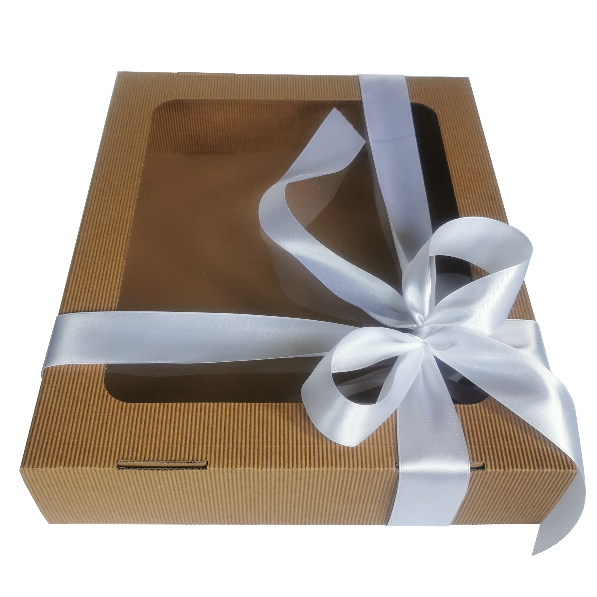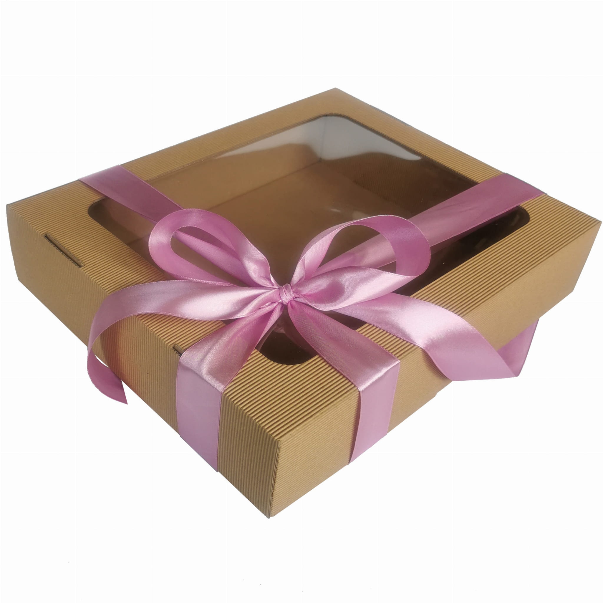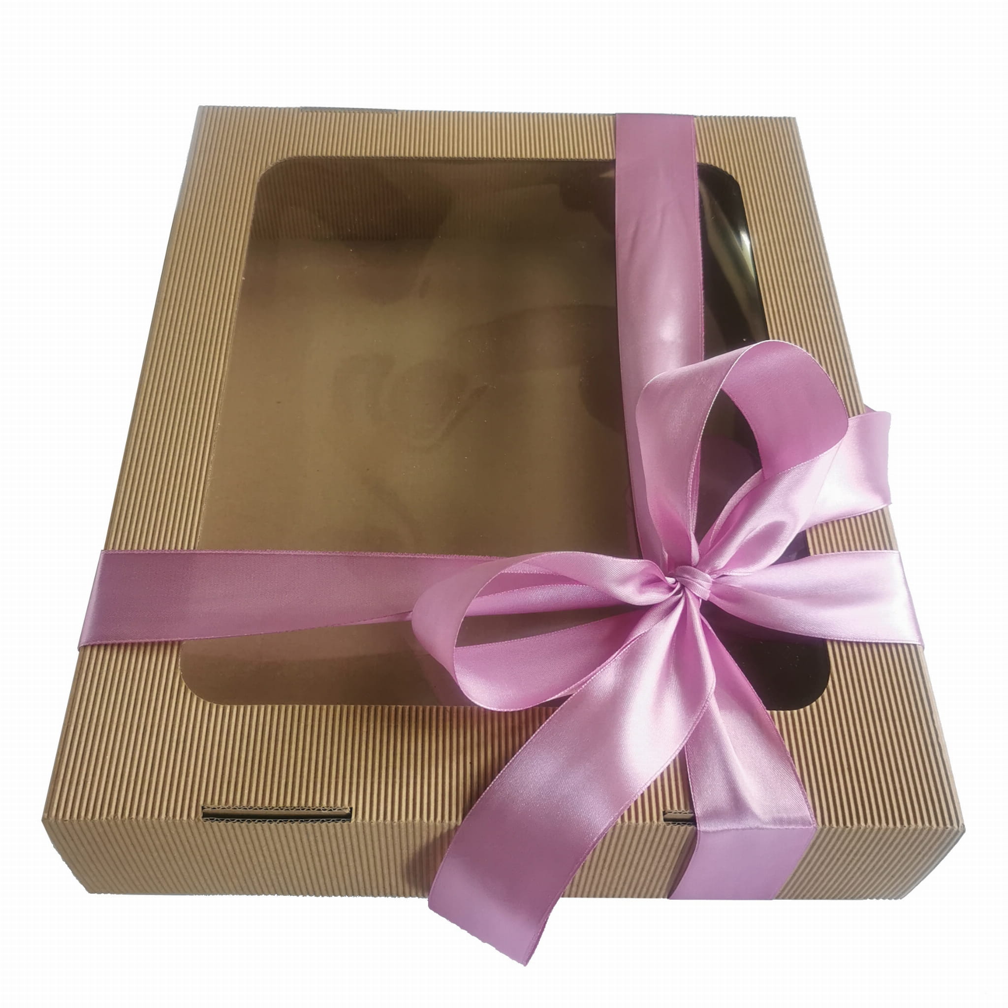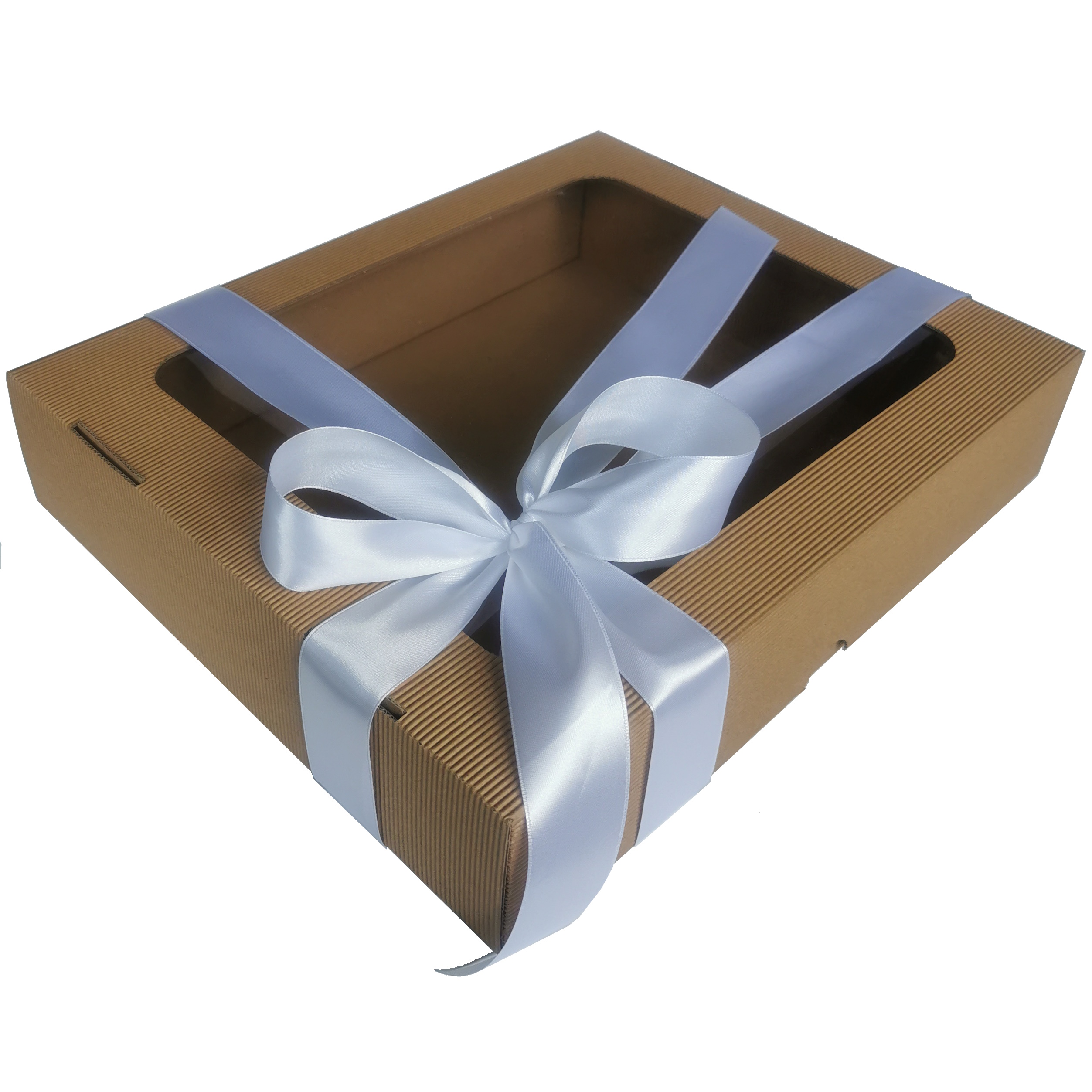 Oto piękne, sztywne pudełko z tektury falistej. Niezastąpione jako box prezentowy i doskonałe jako pudełko do przechowywania. Elegancka tektura, wielkie okno, duży format. A do tego satynowa wstążka w kolorze do wyboru. Każdy zestaw prezentowy chciałby zamieszkać w takim pudełku!