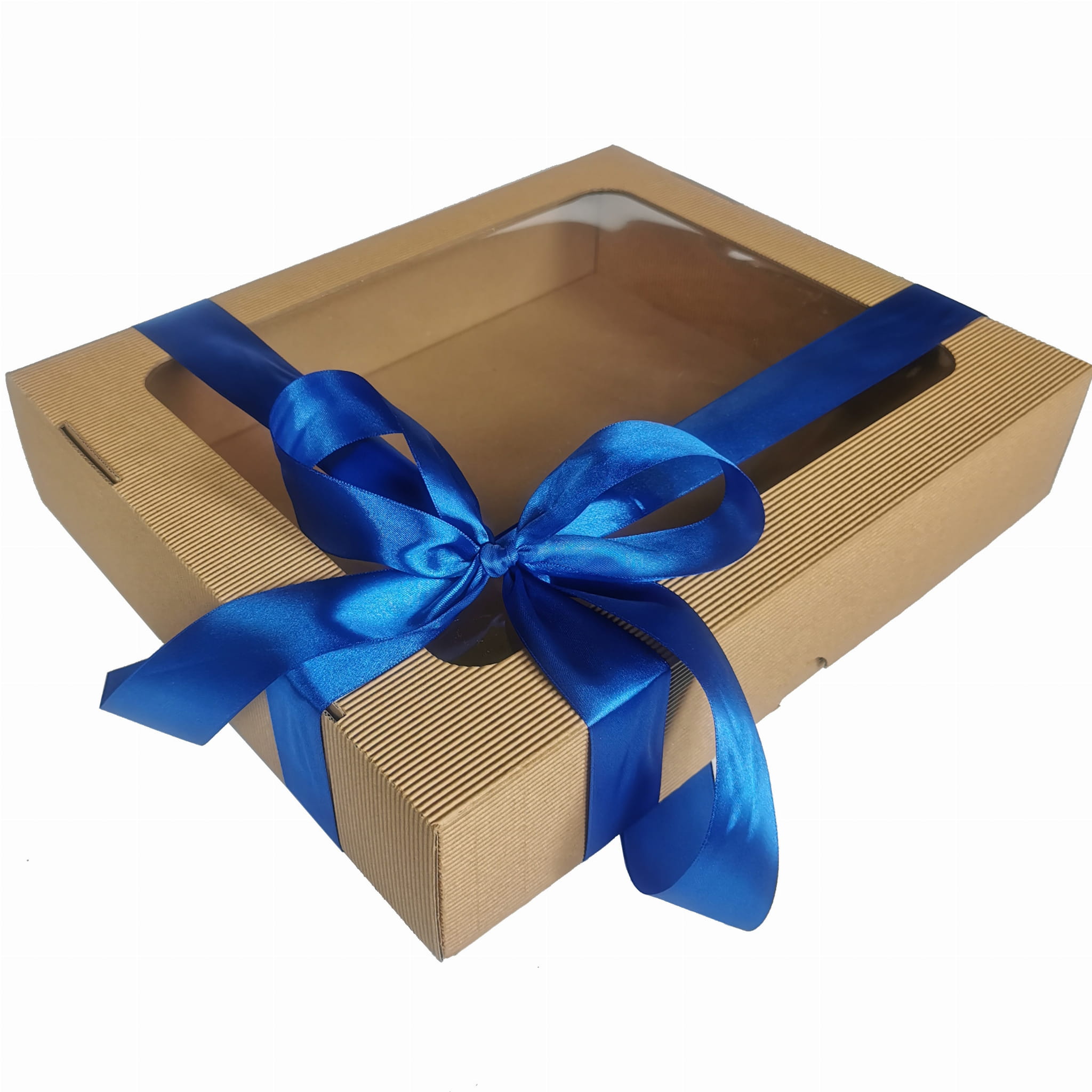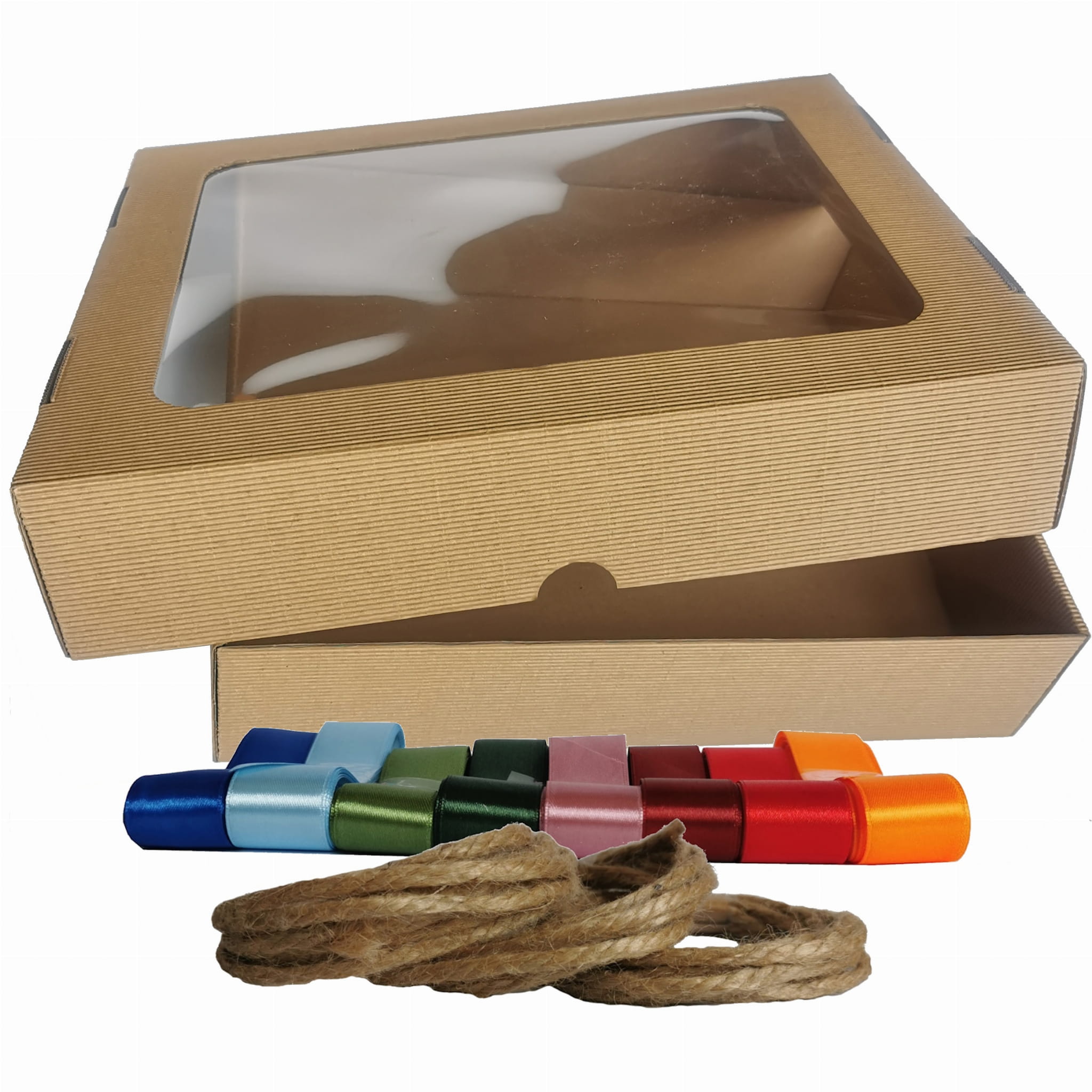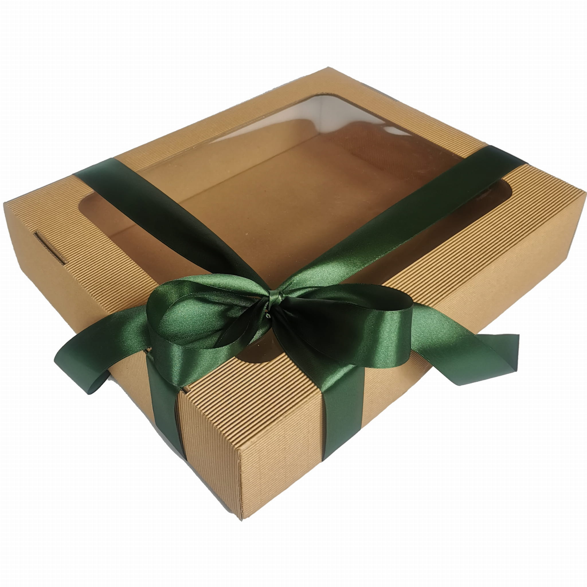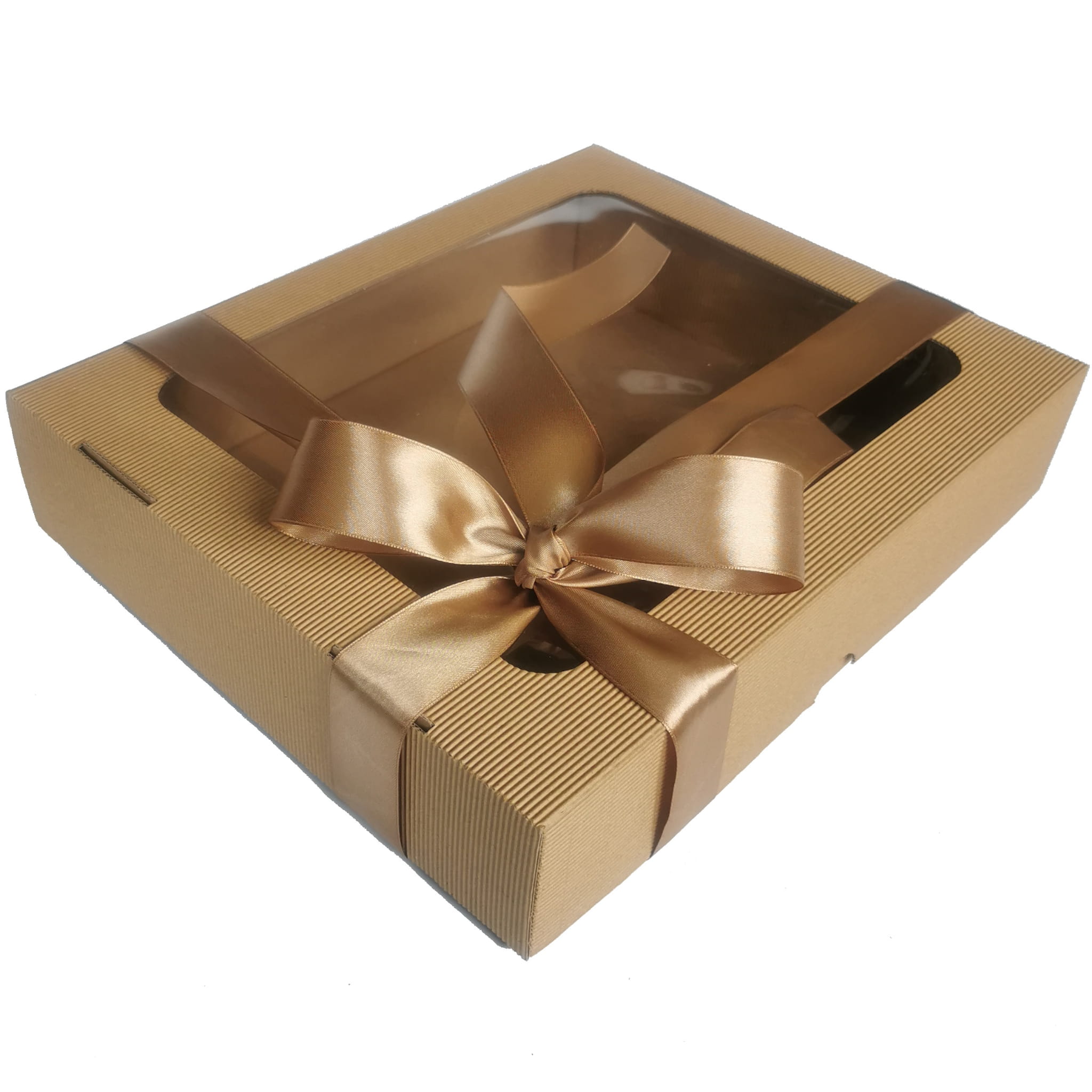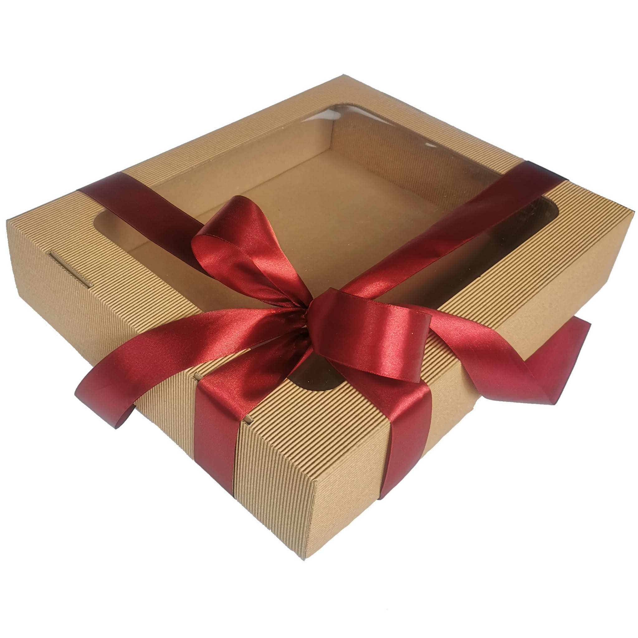 Oto piękne, sztywne pudełko z tektury falistej. Niezastąpione jako box prezentowy i doskonałe jako pudełko do przechowywania. Elegancka tektura, wielkie okno, duży format. A do tego satynowa wstążka w kolorze do wyboru. Każdy zestaw prezentowy chciałby zamieszkać w takim pudełku!