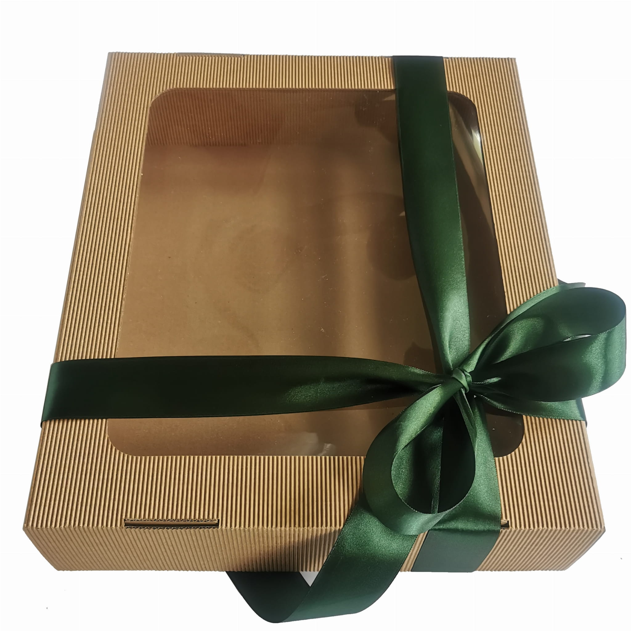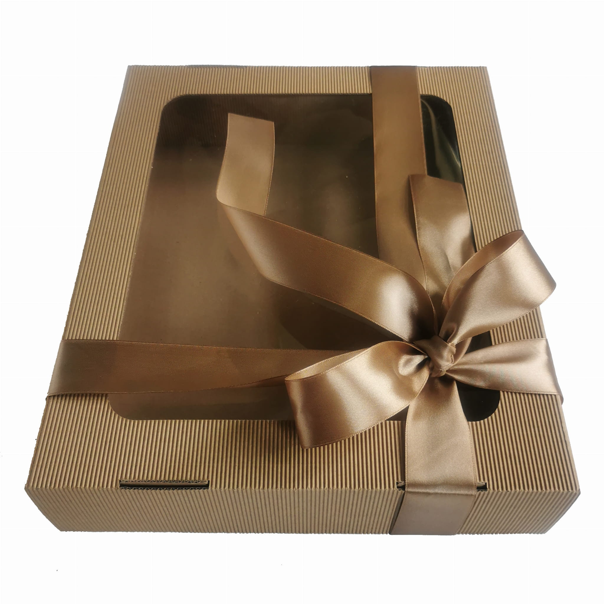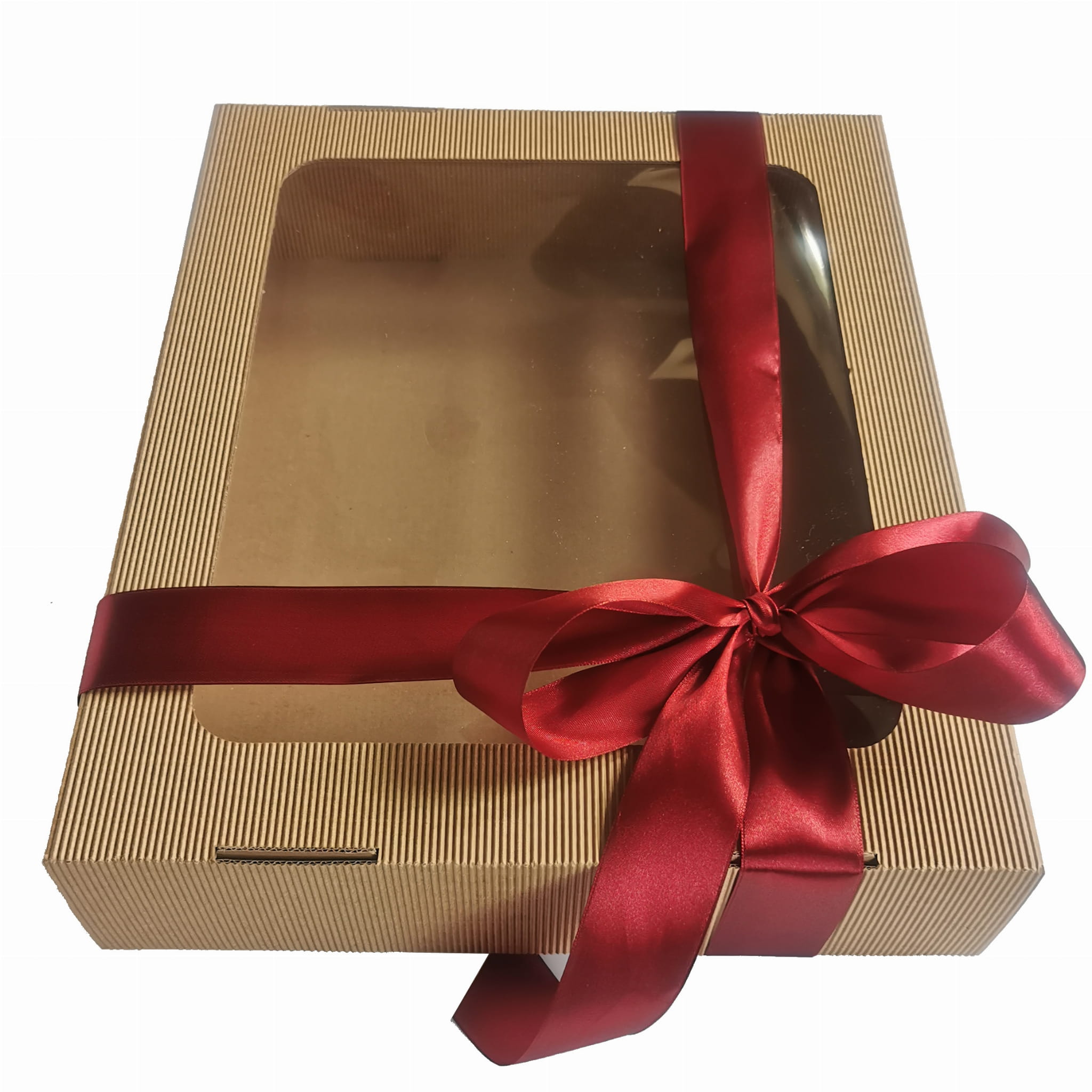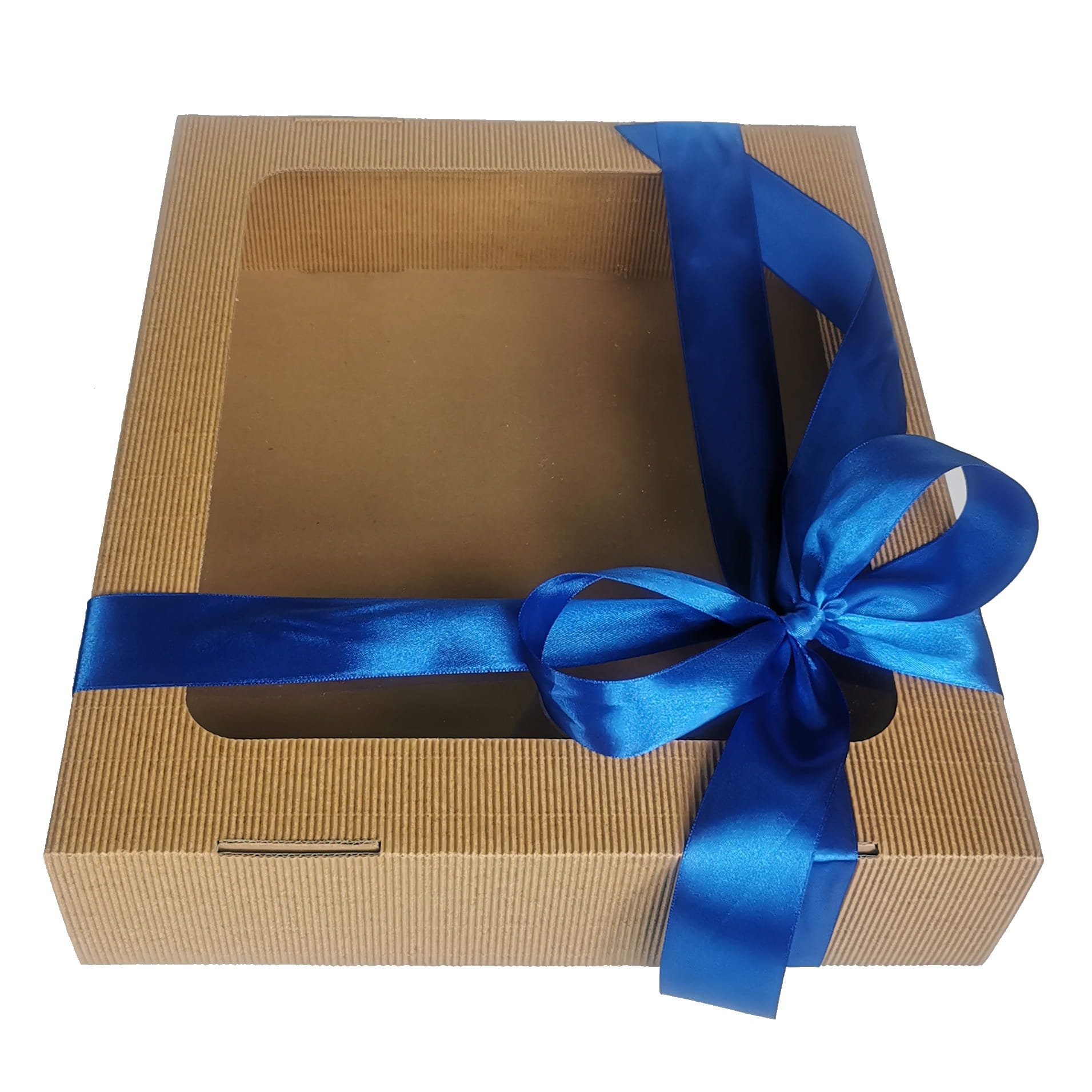Oto piękne, sztywne pudełko z tektury falistej. Niezastąpione jako box prezentowy i doskonałe jako pudełko do przechowywania. Elegancka tektura, wielkie okno, duży format. A do tego satynowa wstążka w kolorze do wyboru. Każdy zestaw prezentowy chciałby zamieszkać w takim pudełku!
